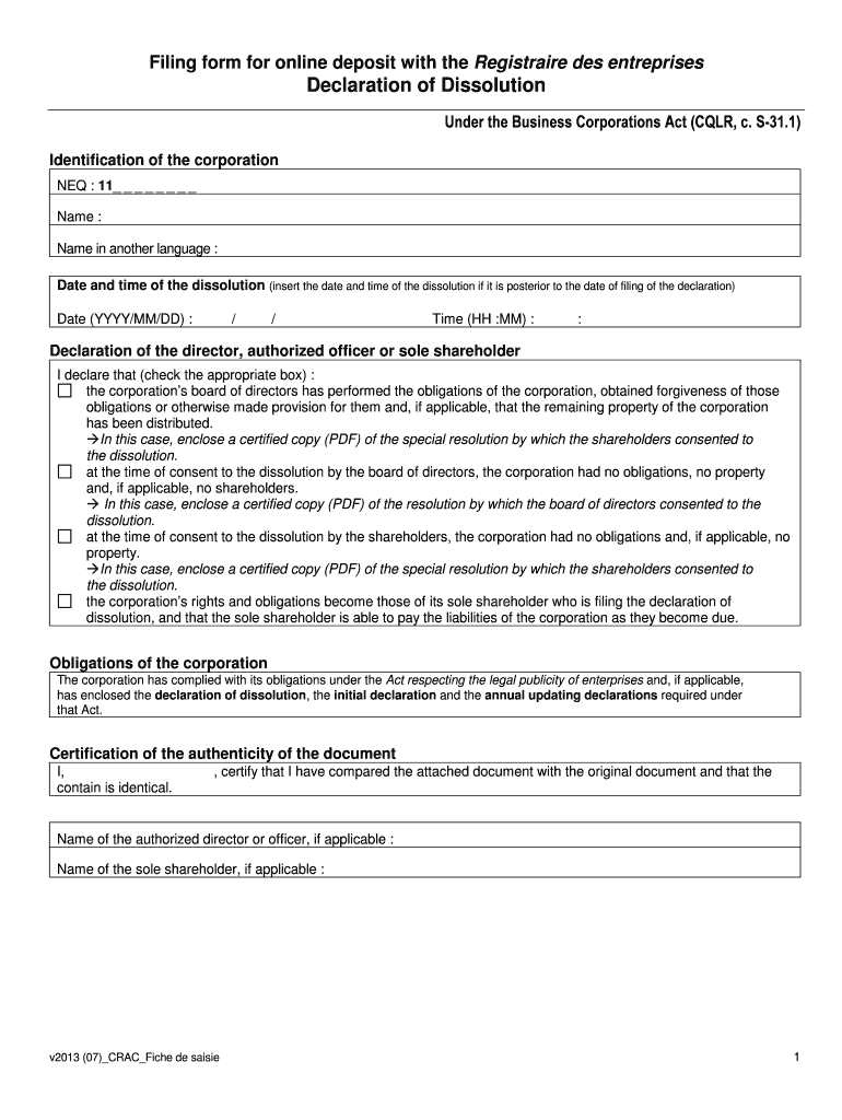 Filing form for online deposit with the Registered DES enterprises Declaration of Dissolution Under the Business Corporations Act (CLR, c. S-31.1) Identification of the corporation NEW : 11 Names