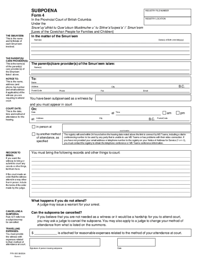 Get the free Subpoena Form 4 - Gov.bc.ca