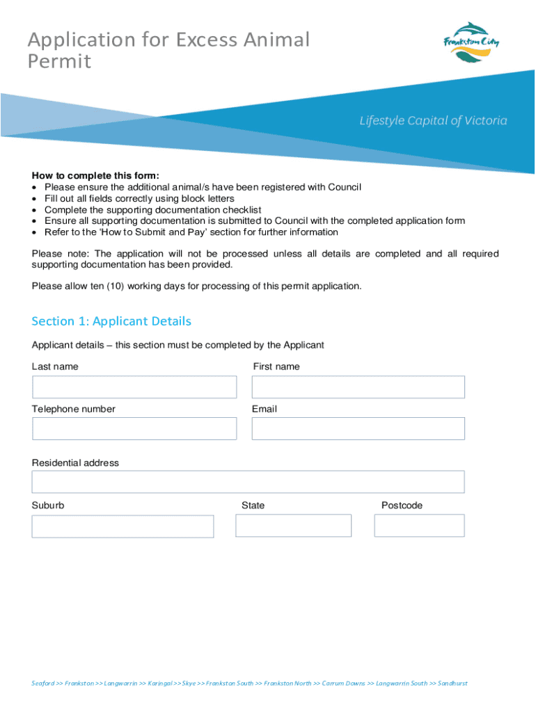 Application for Excess Animal Permit to complete this form: Please ensure the additional animal/s have been registered with Council Fill out all fields correctly using block letters Complete the supporting