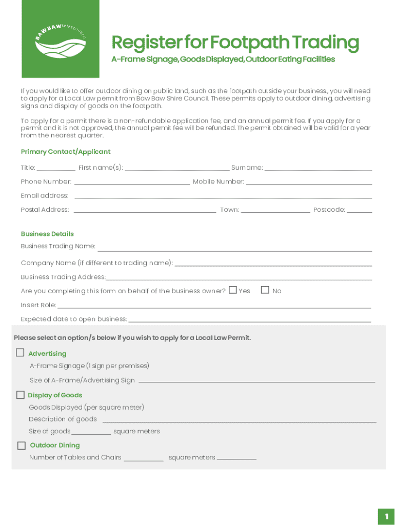 To fill out apply for footpathoutdoor trading, business owners must provide information about their business, the type of trading activities they wish to conduct, and adhere to any relevant regulations set by the local authorities.
