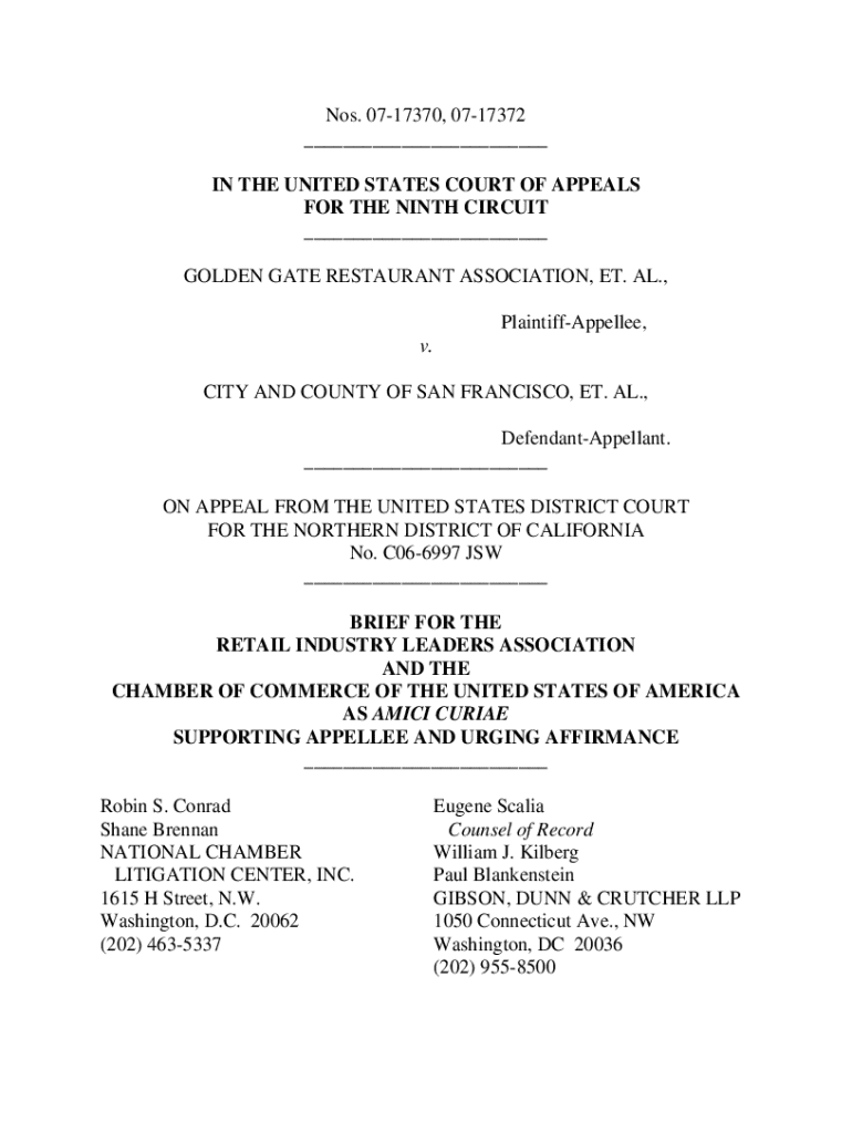 Nos. 0717370, 0717372 ___ IN THE UNITED STATES COURT OF APPEALS FOR THE NINTH CIRCUIT ___ GOLDEN GATE RESTAURANT ASSOCIATION, ET. AL., PlaintiffAppellee, v. CITY AND COUNTY OF SAN FRANCISCO, ET. AL.,