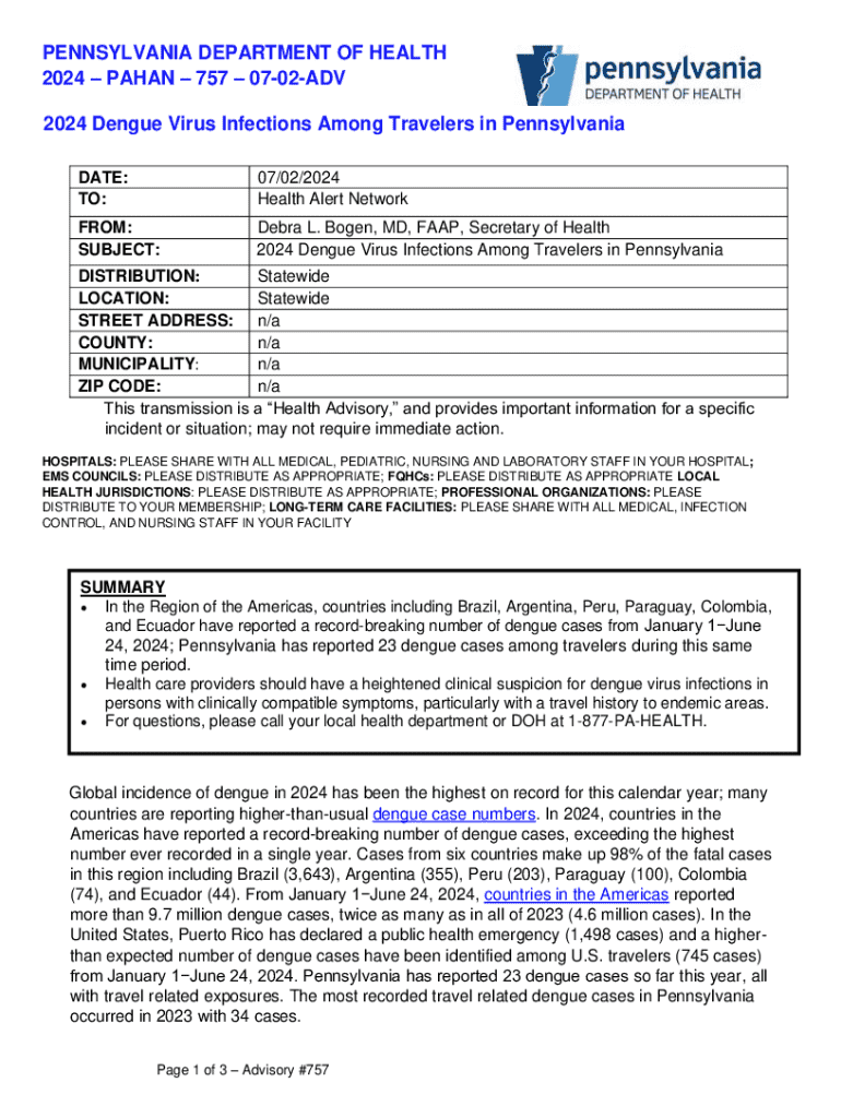PENNSYLVANIA DEPARTMENT OF HEALTH 2024 PAGAN 757 0702ADV 2024 Dengue Virus Infections Among Travelers in Pennsylvania DATE: TO:07/02/2024 Health Alert Networker: SUBJECT:Debra L. Bowen, MD, FLAP,