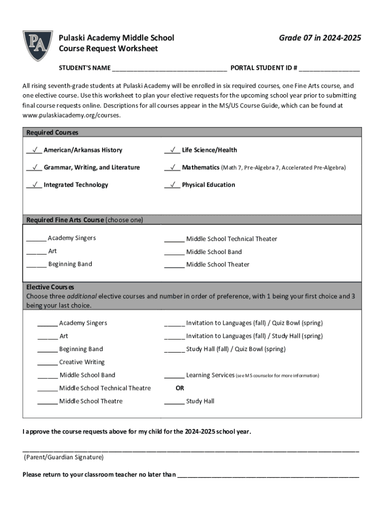 Pulaski Academy Middle School Course Request WorksheetGrade 07 in 20242025STUDENT\'S NAME ___ PORTAL STUDENT ID # ___ All rising seventhgrade students at Pulaski Academy will be enrolled in six required
