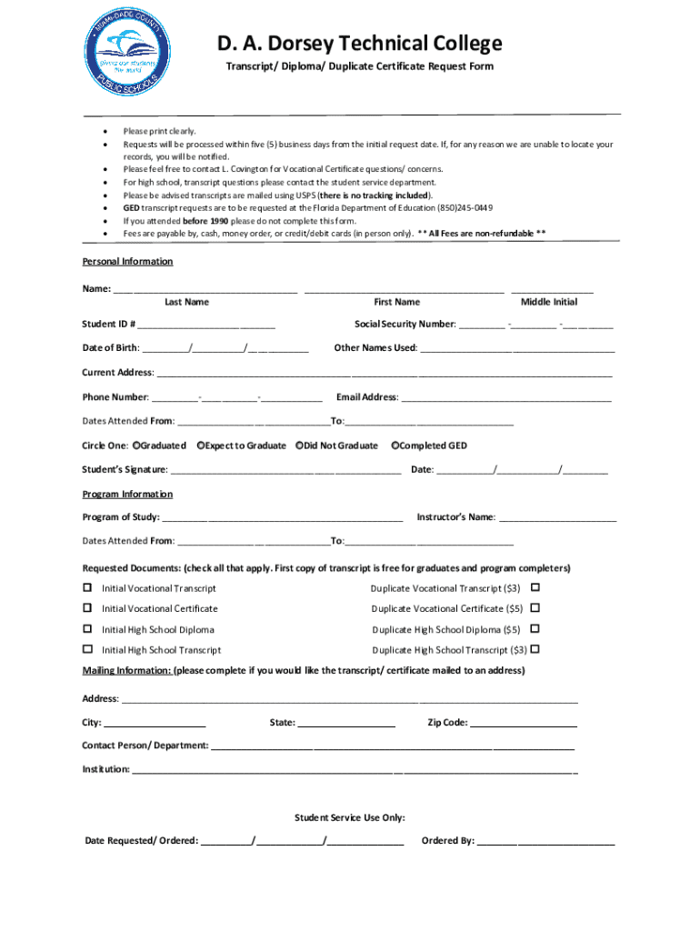 D. A. Dorsey Technical College Transcript/ Diploma/ Duplicate Certificate Request Form Please print clearly. Requests will be processed within five (5) business days from the initial request date.