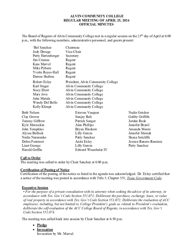 The Board of Regents of Alvin Community College met in a regular session on the 25th day of April at 6:00