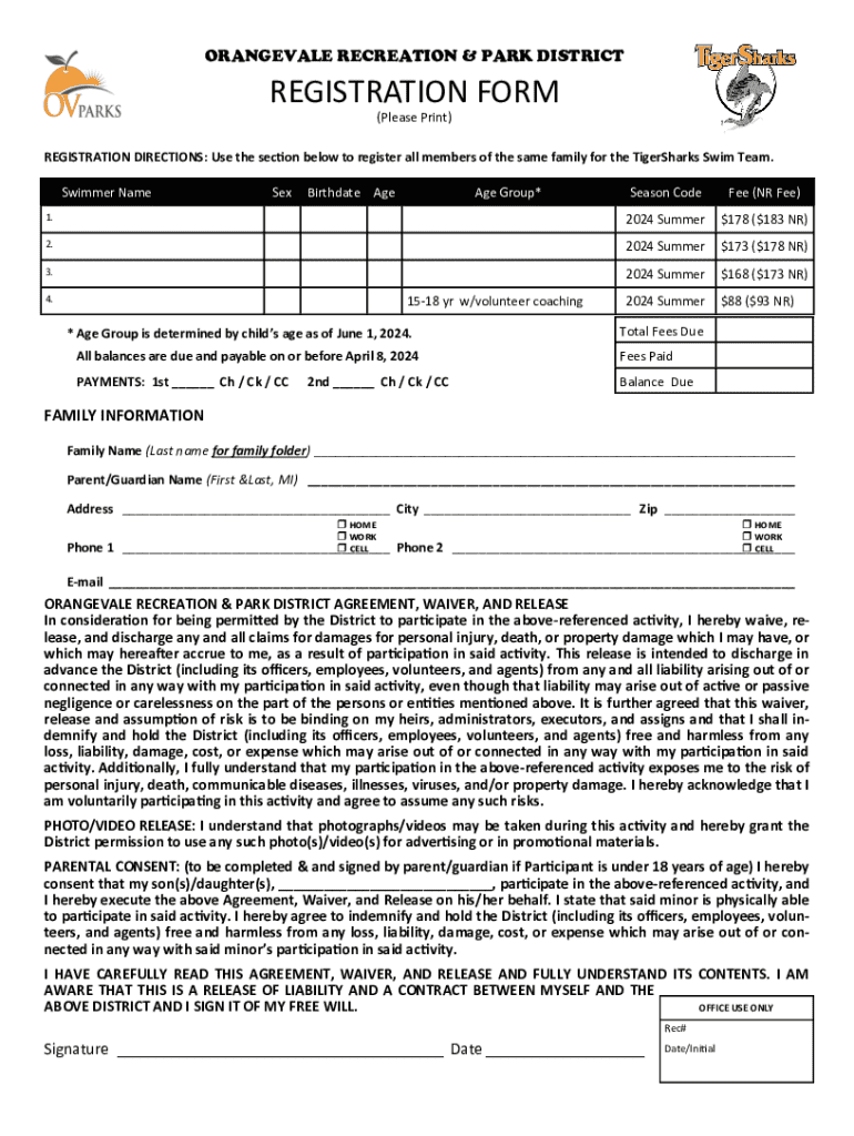 ORANGEADE RECREATION & PARK DISTRICTREGISTRATION FORM (Please Print)REGISTRATION DIRECTIONS: Use the section below to register all members of the same family for the TigerS harks Swim Team. Swimmer