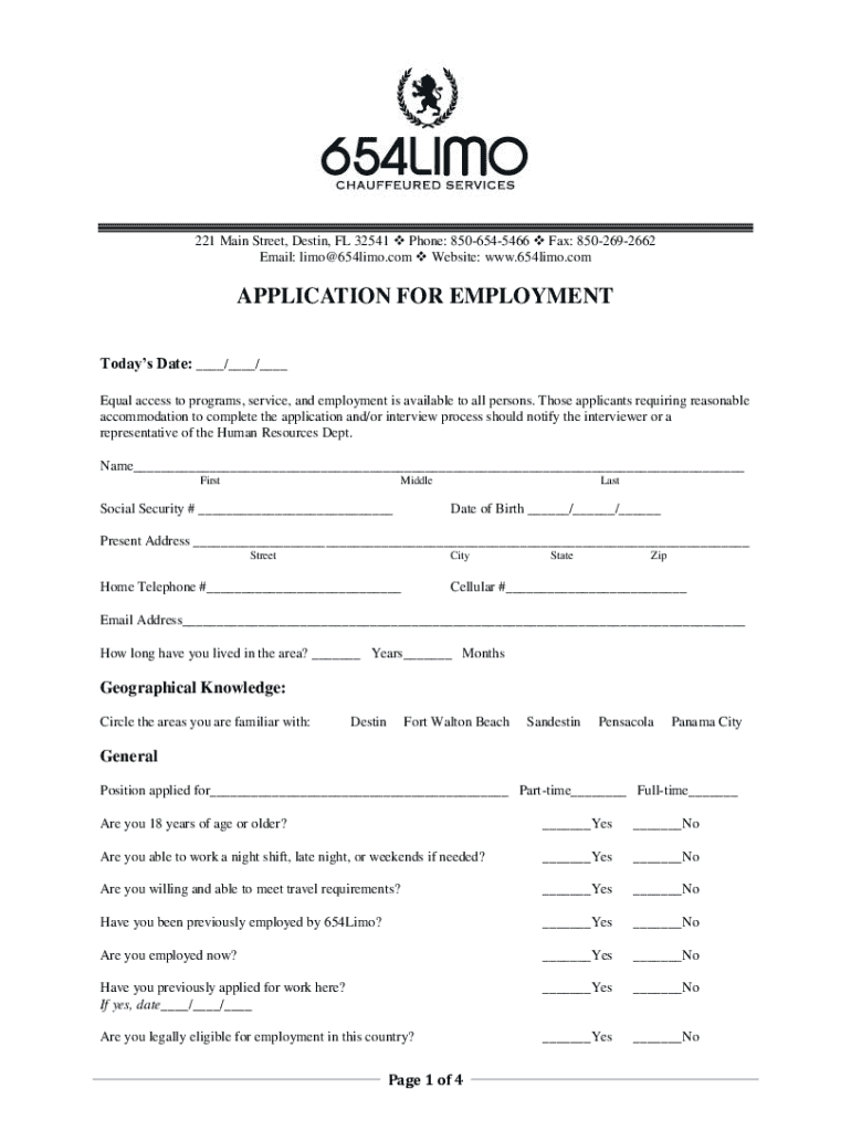 221 Main Street, Destiny, FL 32541 Phone: 8506545466 Fax: 8502692662 Email: limo@654limo.com Website: www.654limo.comAPPLICATION FOR EMPLOYMENT Today's Date: ___/___/___ Equal access to programs,