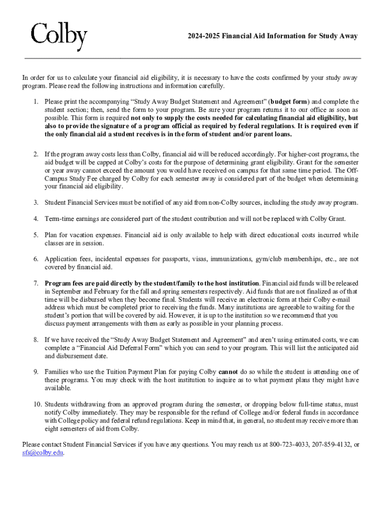 20242025 Financial Aid Information for Study Away In order for us to calculate your financial aid eligibility, it is necessary to have the costs confirmed by your study away program. Please read the
