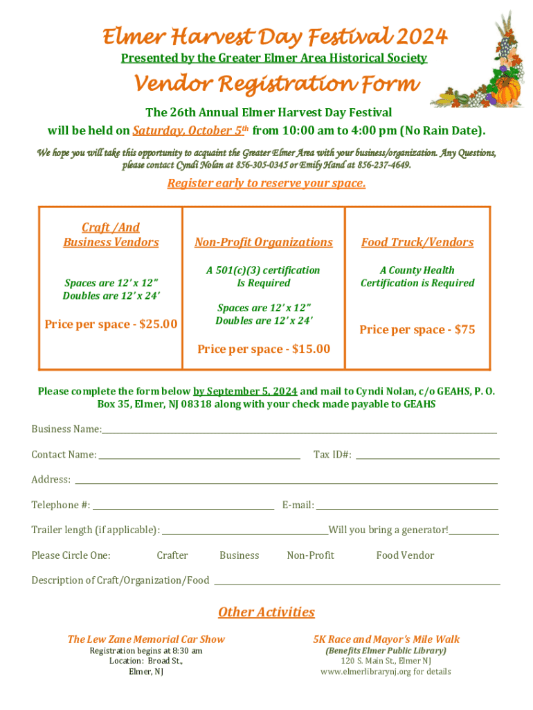 Elmer Harvest Day Festival 2024 Presented by the Greater Elmer Area Historical SocietyVendor Registration Form The 26th Annual Elmer Harvest Day Festival will be held on Saturday, October 5th from