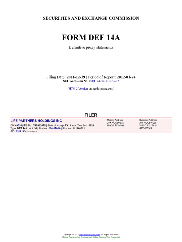 Get the free LIFE PARTNERS HOLDINGS INC (Form: DEF 14A, Filing Date