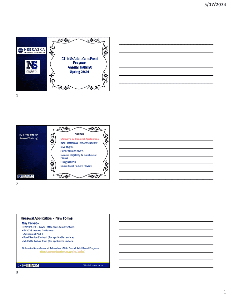 5/17/2024Child & Adult Care Food Program Annual Training Spring 20241FY 2024 CACFP Annual TrainingAgenda Welcome & Renewal Application Meal Pattern & Records Review Civil Rights General Reminders