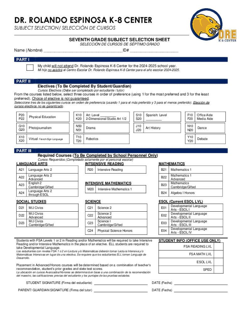 DR. ROLANDO ESPINOSA K8 CENTER SUBJECT SELECTION/ SELECCIN DE CURSOS SEVENTH GRADE SUBJECT SELECTION SHEET SELECCIN DE CURSOS DE SPTIMO GRADOName (Nombre) ___ID# ___ PART I My child will not attend
