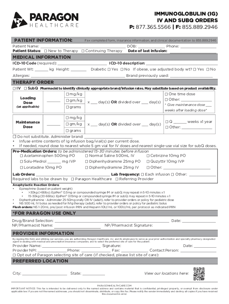 IMMUNOGLOBULIN (IG) IV AND SUBQ ORDERS P: 877.365.5566 | F: 855.889.2946 PATIENT INFORMATION:Fax completed form, insurance information, and clinical documentation to 855.889.2946Patient Name: ___