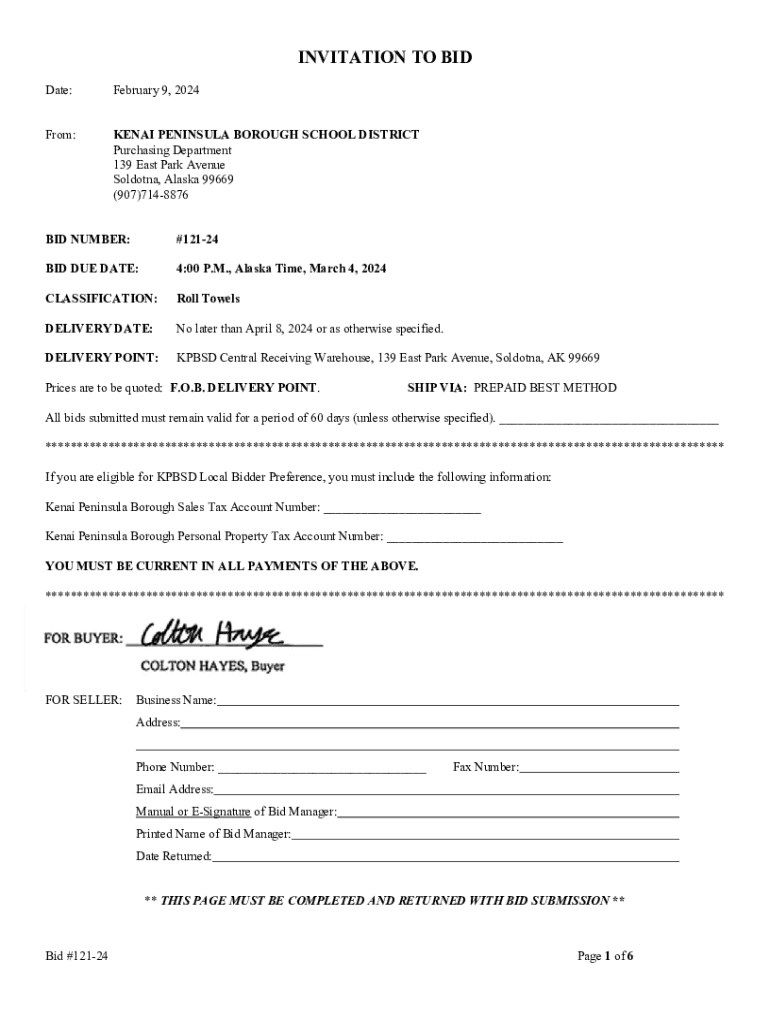 INVITATION TO BID Date:February 9, 2024From:KENAI PENINSULA BOROUGH SCHOOL DISTRICT Purchasing Department 139 East Park Avenue Soldotna, Alaska 99669 (907)7148876BID NUMBER:#12124BID DUE DATE:4:00