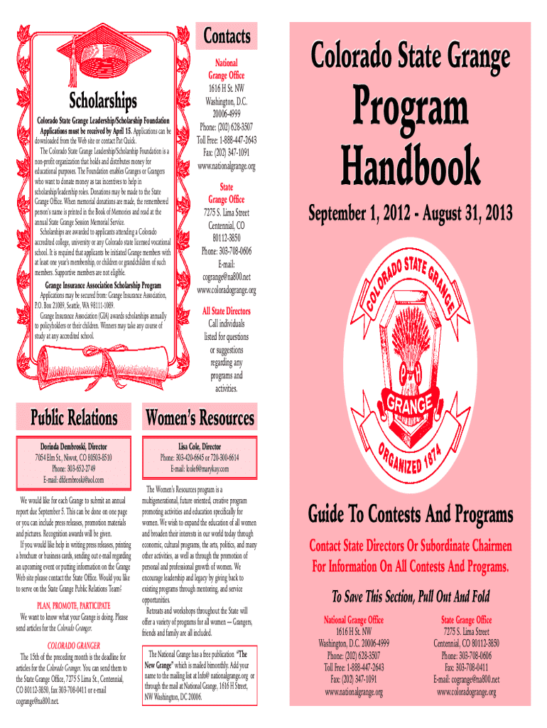 Contacts Scholarships Colorado State Grange Leadership/Scholarship Foundation Applications must be received by April 15. Applications can be downloaded from the Web site or contact Pat Quick. The