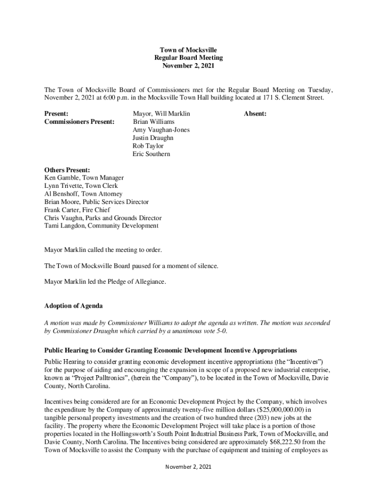 Town of Rockville Regular Board Meeting November 2, 2021The Town of Rockville Board of Commissioners met for the Regular Board Meeting on Tuesday, November 2, 2021, at 6:00 p.m. in the Rockville Town