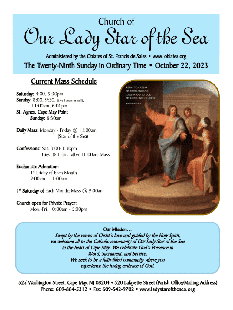 Church four Lady Star of the Sea Administered by the Oblate of St. Francis de Sales WWW. Oblates.writhe Twentieth Sunday in Ordinary Time October 22, 2023, Current Mass Schedule Saturday: 4:00, 5:30pm