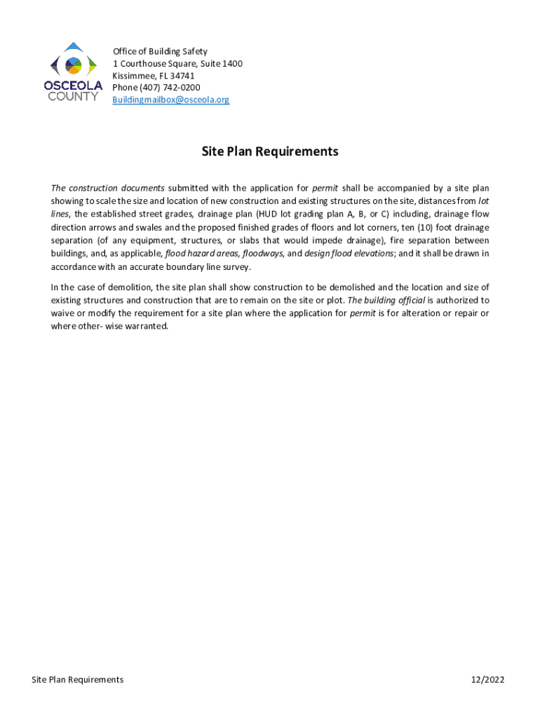 Office of Building Safety 1 Courthouse Square, Suite 1400 Kissimmee, FL 34741 Phone (407) 7420200 Buildingmailbox@osceola.orgSite Plan Requirements The construction documents submitted with the application