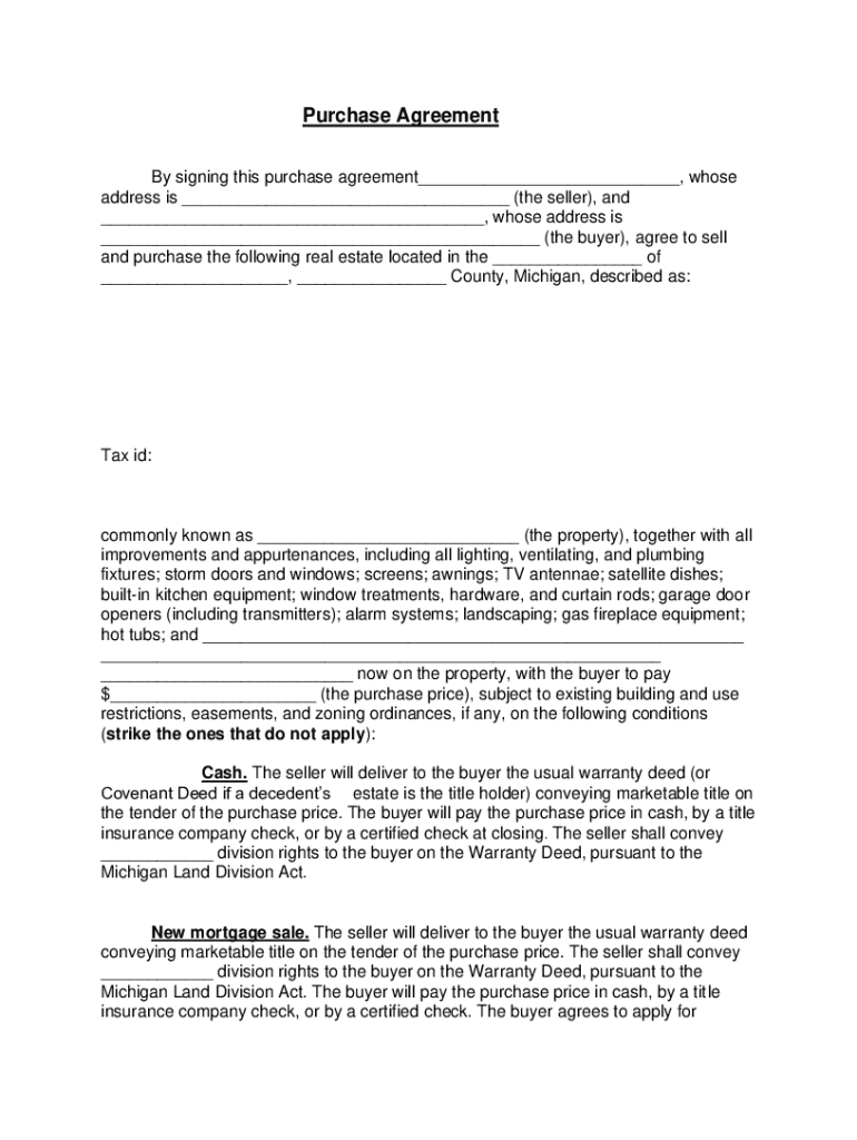 Purchase Agreement By signing this purchase agreement___, whose address is ___ (the seller), and ___, whose address is ___ (the buyer), agree to sell and purchase the following real estate located