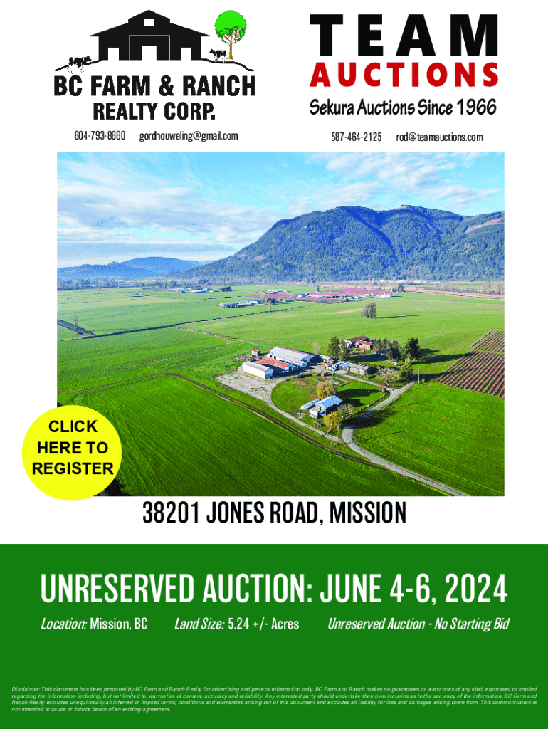 6047938660gordhouweling@gmail.com5874642125rod@teamauctions.comCLICK HERE TO REGISTER38201 JONES ROAD, MISSIONUNRESERVED AUCBlandJUNE 46, 2024 Location: Mission, BCLan Size: 5.24 +Disclaimerrved Auction