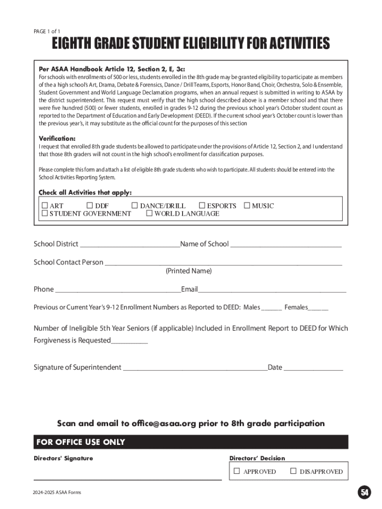 PAGE 1 of 1EIGHTH GRADE STUDENT ELIGIBILITY FOR ACTIVITIESPer ASAA Handbook Article 12, Section 2, E, 3c: For schools with enrollments of 500 or less, students enrolled in the 8th grade may be granted