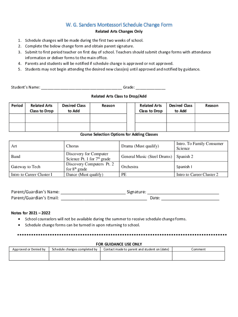 W. G. Sanders Montessori Schedule Change Form Related Arts Changes Only 1. Schedule changes will be made during the first two weeks of school. 2. Complete the below change form and obtain parent signature.