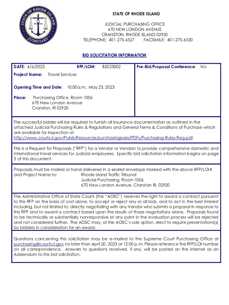 STATE OF RHODE ISLAND JUDICIAL PURCHASING OFFICE 670 NEW LONDON AVENUE CRANSTON, RHODE ISLAND 02920 TELEPHONE: 4012756527 FACSIMILE: 4012756530 BID SOLICITATION INFORMATION DATE: 4/6/2023 Project
