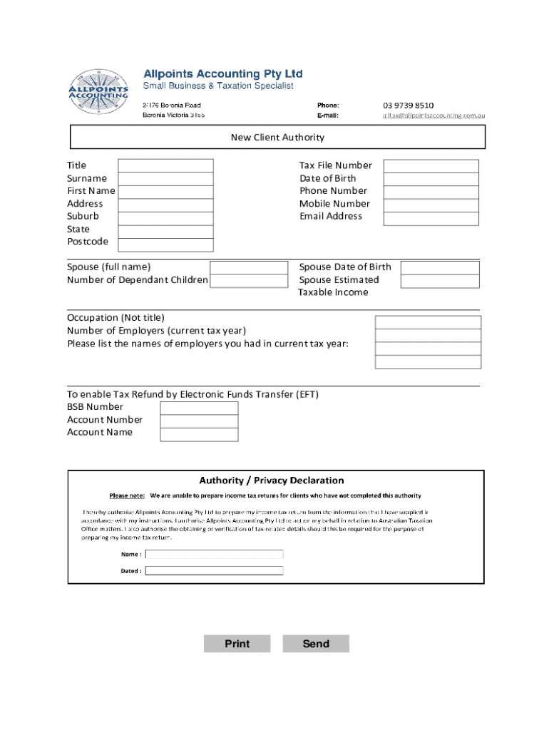 New Client Authority Title Tax File Number Surname Date of Birth First Name Phone Number Address Mobile Number Suburb Email Address State Postcode ___ Spouse (full name) Spouse Date of Birth Number