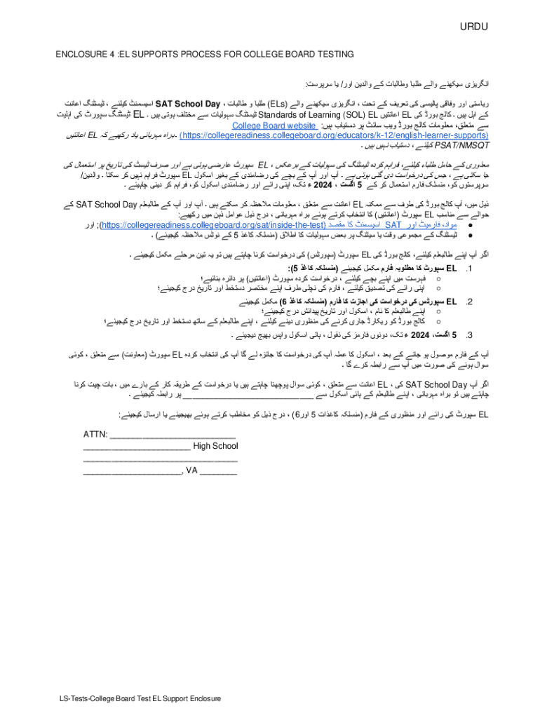 URDU ENCLOSURE 4 :EL SUPPORTS PROCESS FOR COLLEGE BOARD TESTING / : ( )ELs SAT School Day