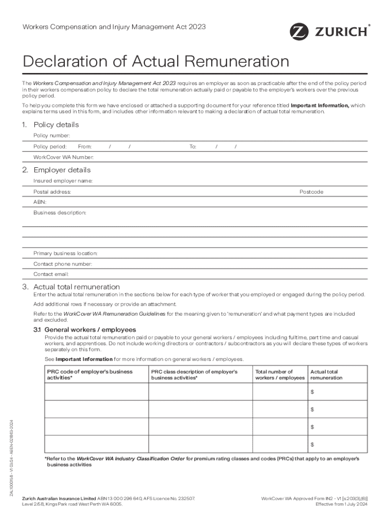 Workers Compensation and Injury Management Act 2023Declaration of Actual Remuneration The Workers Compensation and Injury Management Act 2023 requires an employer as soon as practicable after the