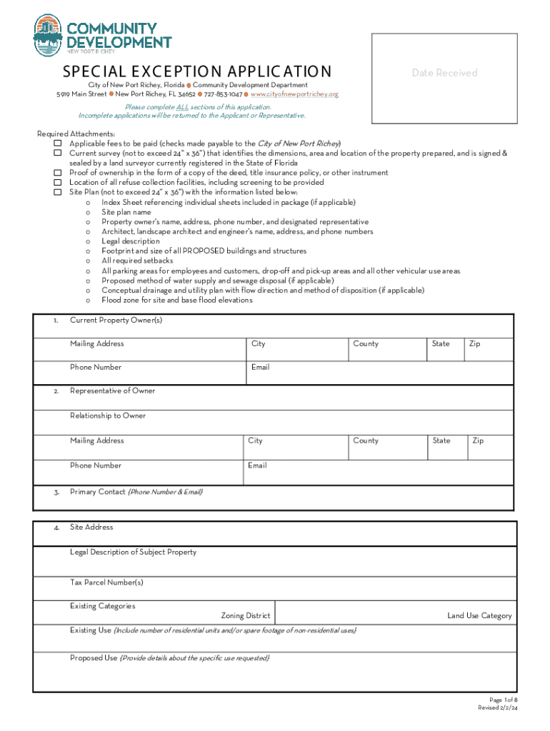 SPE C IAL E XC E PTIO N APPLIC ATIO NDate ReceivedCity of New Port Richey, Florida Community Development Department 5919 Main Street New Port Richey, FL 34652 7278531047 www.cityofnewportrichey.orgPlease