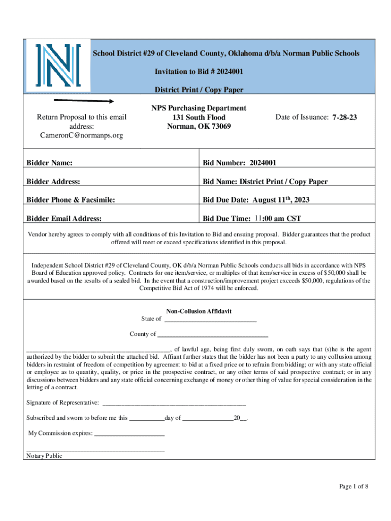 IndependentSchool District #29 of Cleveland County, Oklahoma d/b/a Norman Public Schools Invitation to Bid # 2024001 District Print / Copy PaperReturn Proposal to this email address: CameronC@normanps.orgNPS