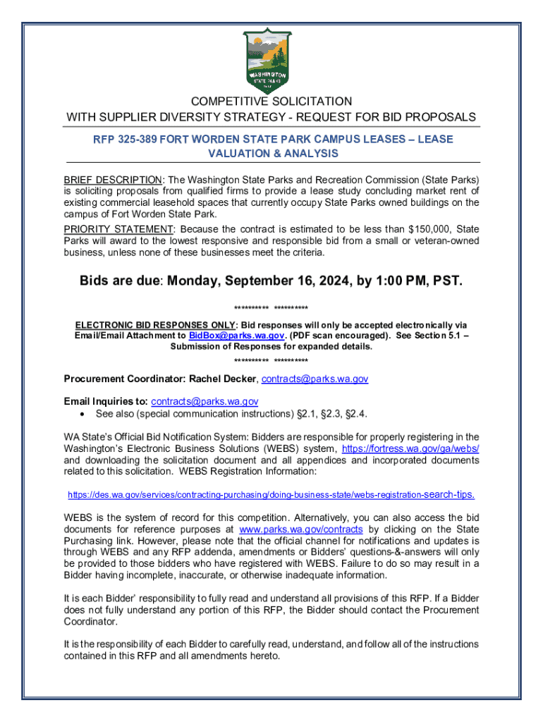 COMPETITIVE SOLICITATION WITH SUPPLIER DIVERSITY STRATEGY REQUEST FOR BID PROPOSALS RFP 325389 FORT WOODEN STATE PARK CAMPUS LEASES LEASE VALUATION & ANALYSIS BRIEF DESCRIPTION: The Washington State