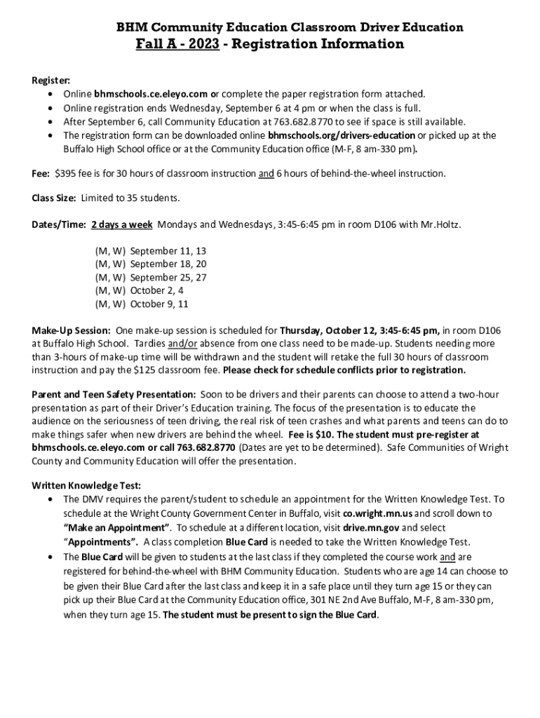 BHM Community Education Classroom Driver EducationFall A 2023 Registration Information Register: Online bhmschools.ce.eleyo.com or complete the paper registration form attached. Online registration