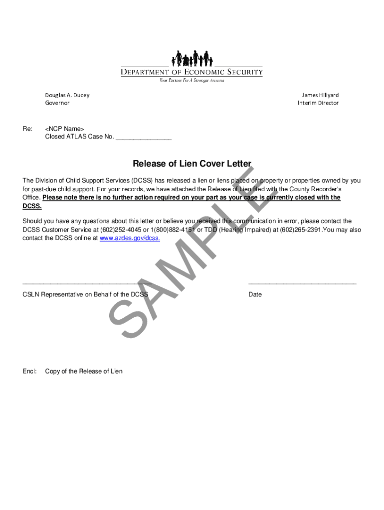 Douglas A. Ducey Governor Re:James Hill yard Interim Director NCP Name Closed ATLAS Case No. ___Release of Lien Cover LetterPLEThe Division of Child Support Services (CSS) has released a lien or liens
