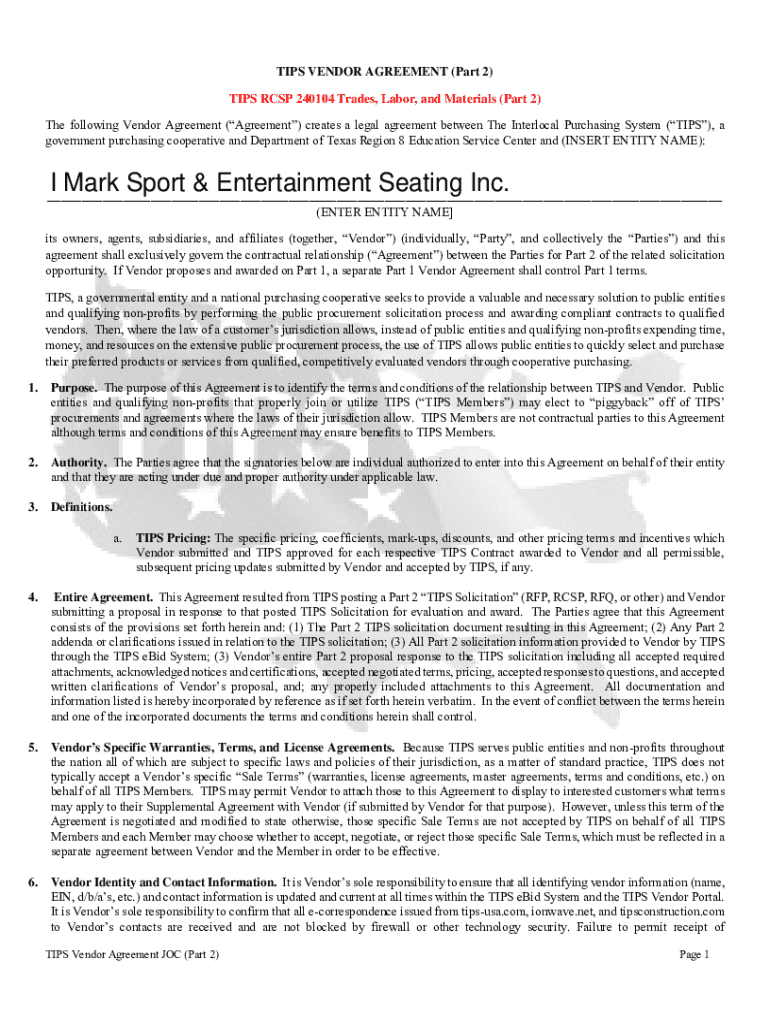 TIPS VENDOR AGREEMENT (Part 2) TIPS RCMP 240104 Trades, Labor, and Materials (Part 2) The following Vendor Agreement (Agreement) creates a legal agreement between The Interlocal Purchasing System