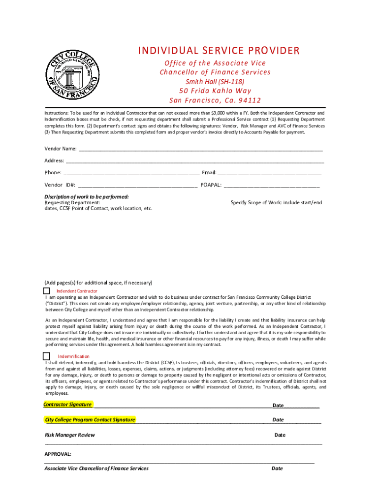 INDIVIDUAL SERVICE PROVIDER Office of the Associate Vice Chancellor of Finance Services Smith Hall (SH118) 50 Frida Kahlo Way San Francisco, Ca. 94112Instructions: To be used for an Individual Contractor