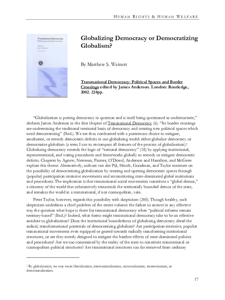 HUMAN RIGHTS & HUMAN WELFAREGlobalizing Democracy or Democratizing Globalism? By Matthew S. We inert Transnational Democracy: Political Spaces and Border Crossings edited by James Anderson. London: