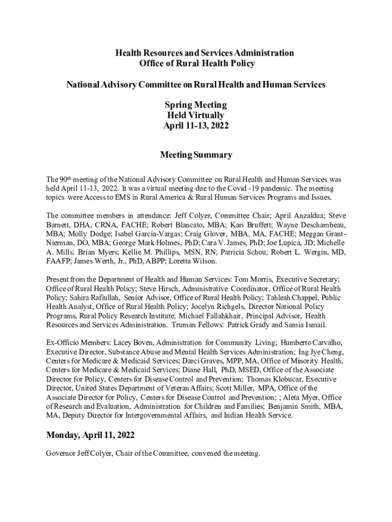 Health Resources and Services Administration Office of Rural Health Policy National Advisory Committee on Rural Health and Human Services Spring Meeting Held Virtually April 1113, 2022 Meeting Summary