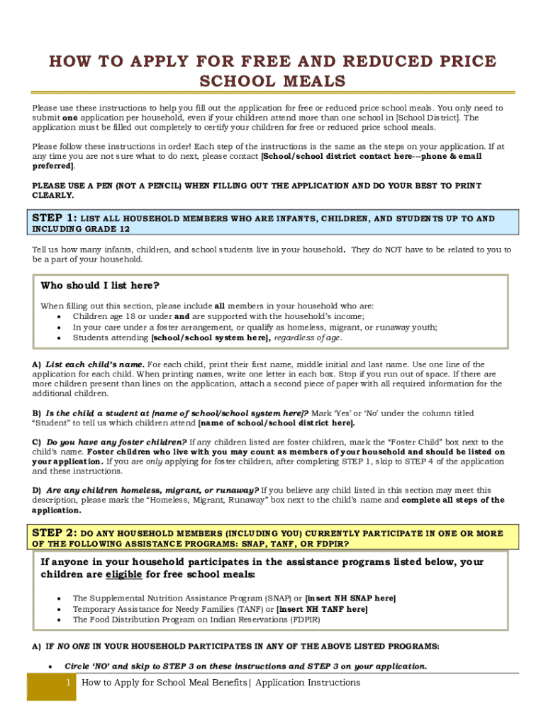 HOW TO APPLY FOR FREE AND REDUCED PRICE SCHOOL MEALS Please use these instructions to help you fill out the application for free or reduced price school meals. You only need to submit one application