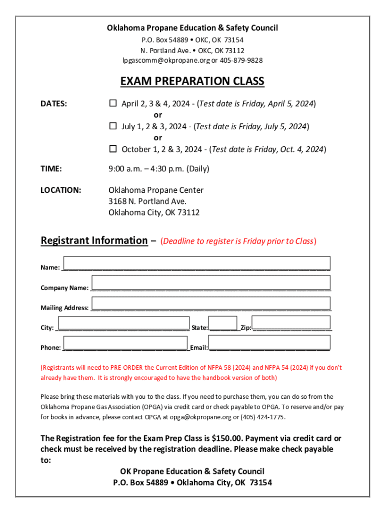 Oklahoma Propane Education & Safety Council P.O. Box 54889 OKC, OK 73154 N. Portland Ave. OKC, OK 73112 lpgascomm@okpropane.org or 4058799828EXAM PREPARATION CLASS DATES: April 2, 3 & 4, 2024 (Test