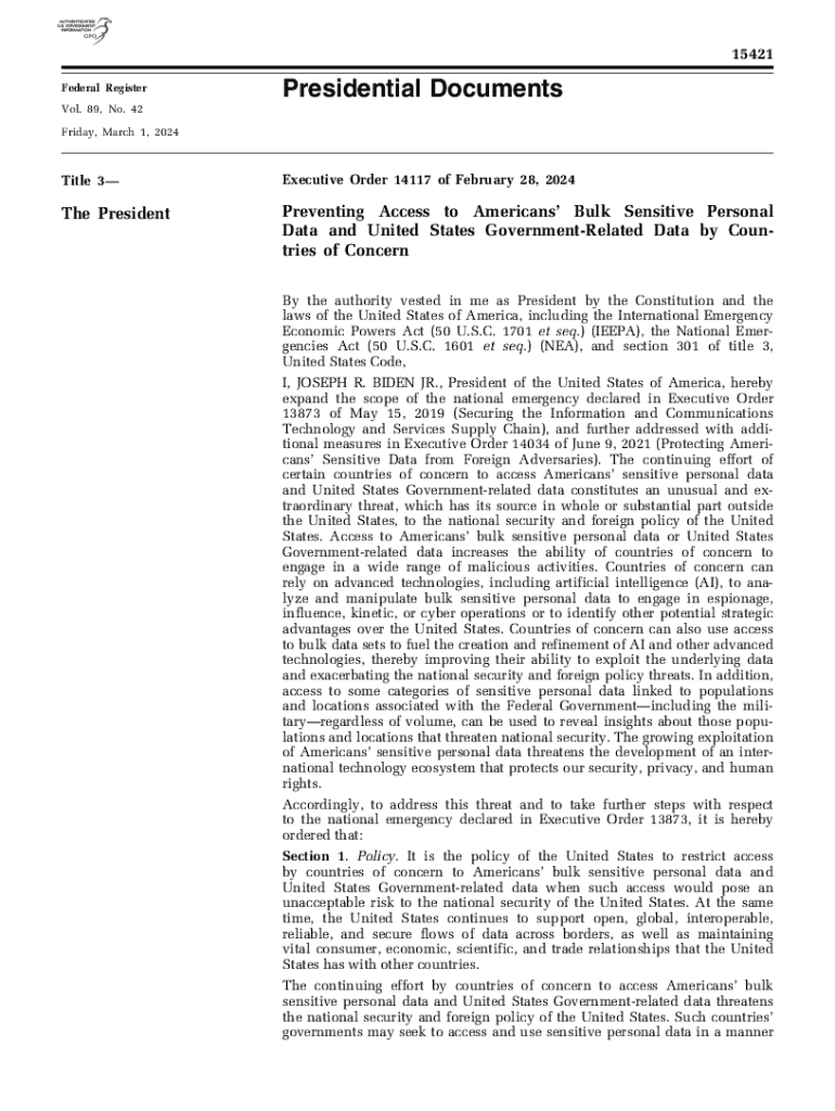 15421Presidential Documents Federal Register Vol. 89, No. 42 Friday, March 1, 2024Title 3Executive Order 14117 of February 28, 2024The PresidentPreventing Access to Americans Bulk Sensitive Personal