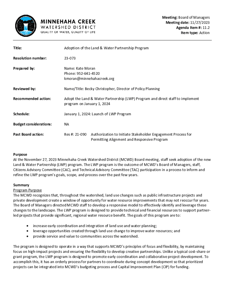 Meeting: Board of Managers Meeting date: 11/27/2023 Agenda Item #: 11.2 Item type: Action Title:Adoption of the Land & Water Partnership ProgramResolution number:23073Prepared by:Name: Kate Moran