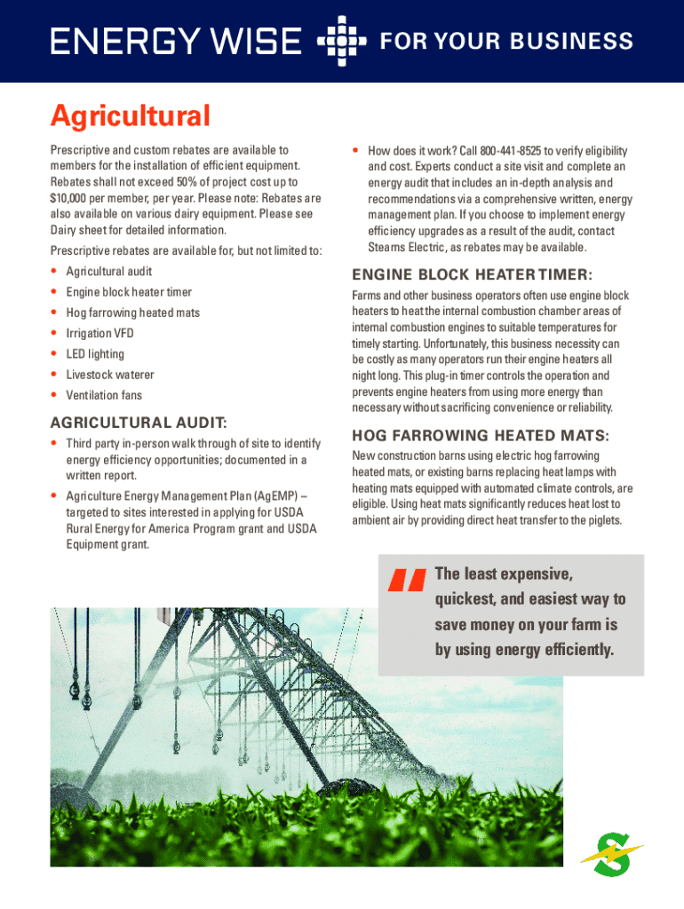 ENERGY WISEFOR YOUR BUSINESSAgricultural Prescriptive and custom rebates are available to members for the installation of efficient equipment. Rebates shall not exceed 50% of project cost up to $10,000