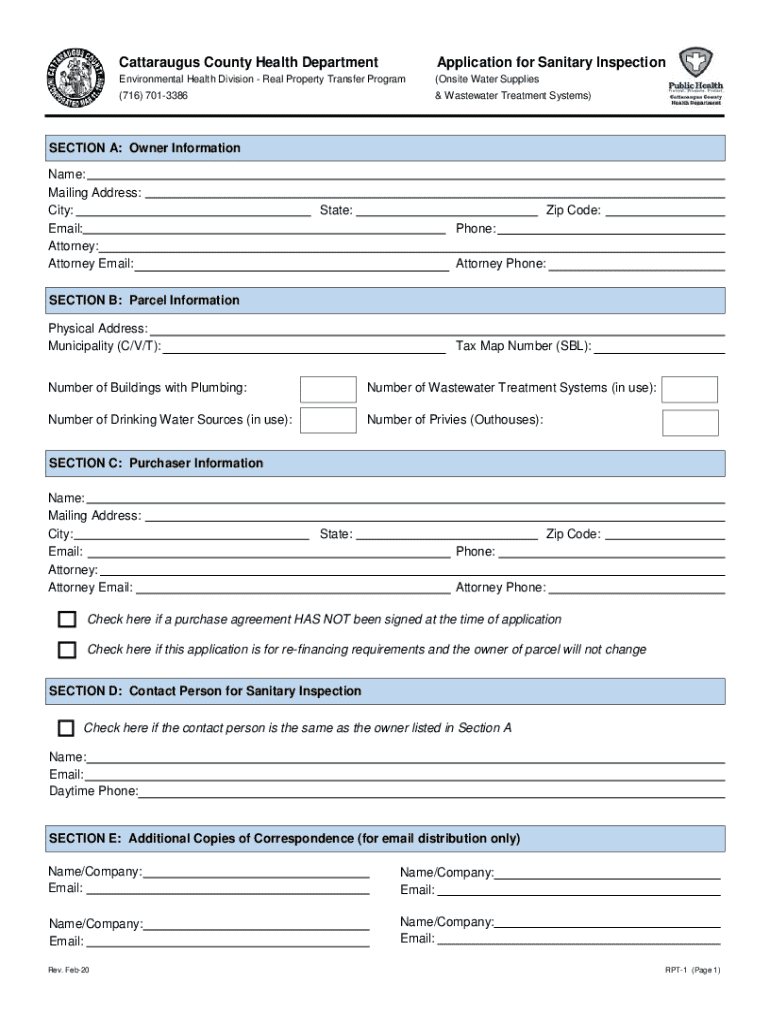 Cattaraugus County Health DepartmentApplication for Sanitary InspectionEnvironmental Health Division Real Property Transfer Program(Onsite Water Supplies(716) 7013386& Wastewater Treatment Systems)SECTION