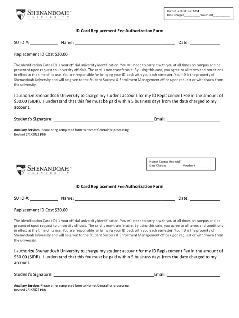 Hornet Central Use: ART Date Charged___ Voucher#___ID Card Replacement Fee Authorization Form SU ID #: ___ Name: ___ Date: ___ Replacement ID Cost $30.00 The Identification Card (ID) is your official