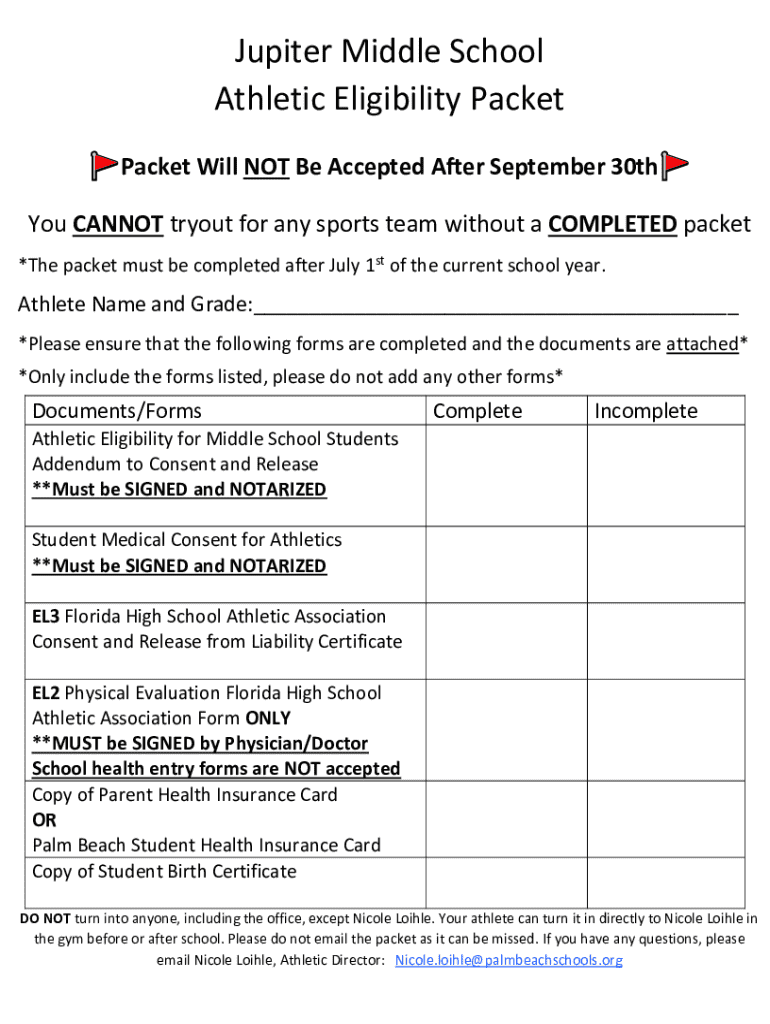 Jupiter Middle School Athletic Eligibility Packet Will NOT Be Accepted After September 30th You CANNOT try out for any sports team without a COMPLETED packet *The packet must be completed after July
