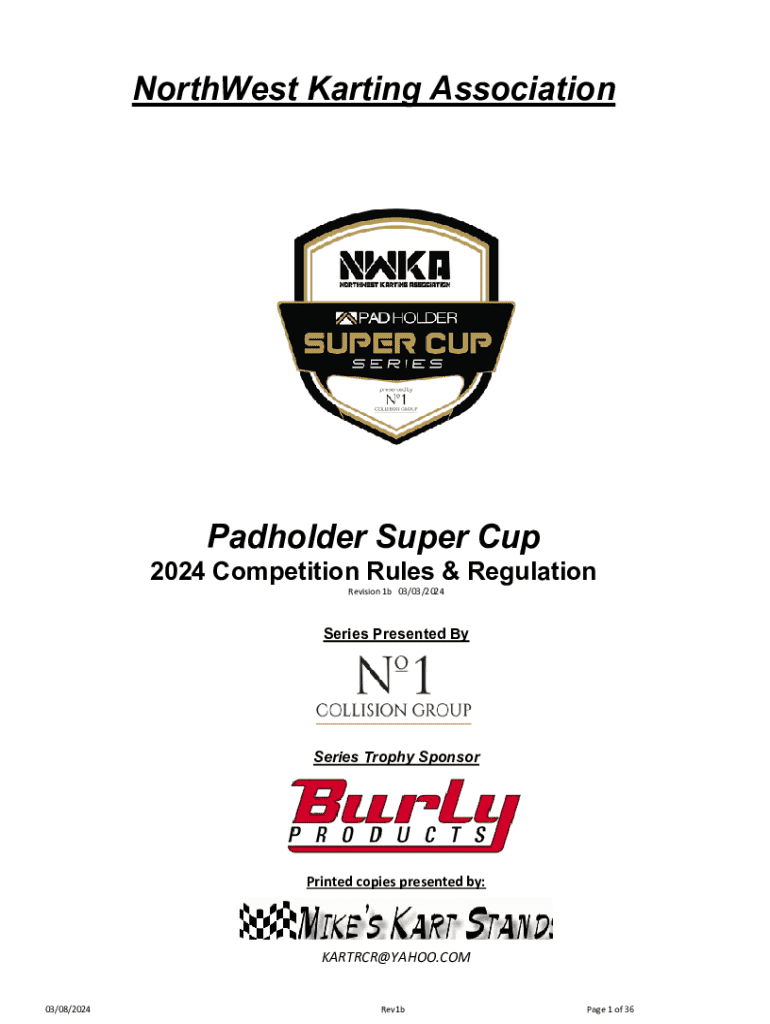 NorthWest Karting AssociationPadholder Super Cup 2024 Competition Rules & Regulation Revision 1b 03/03/2024Series Presented BySeries Trophy SponsorPrinted copies presented by:KARTRCR@YAHOO.COM 03/08/2024Rev1bPage