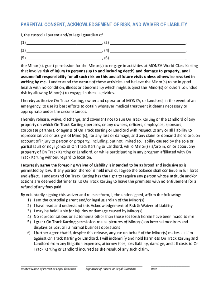 PARENTAL CONSENT, ACKNOWLEDGEMENT OF RISK, AND WAIVER OF LIABILITY I, the custodial parent and/or legal guardian of (1) ___, (2) ___, (3) ___, (4) ___, (5) ___, (6) ___, the Minor(s), grant permission