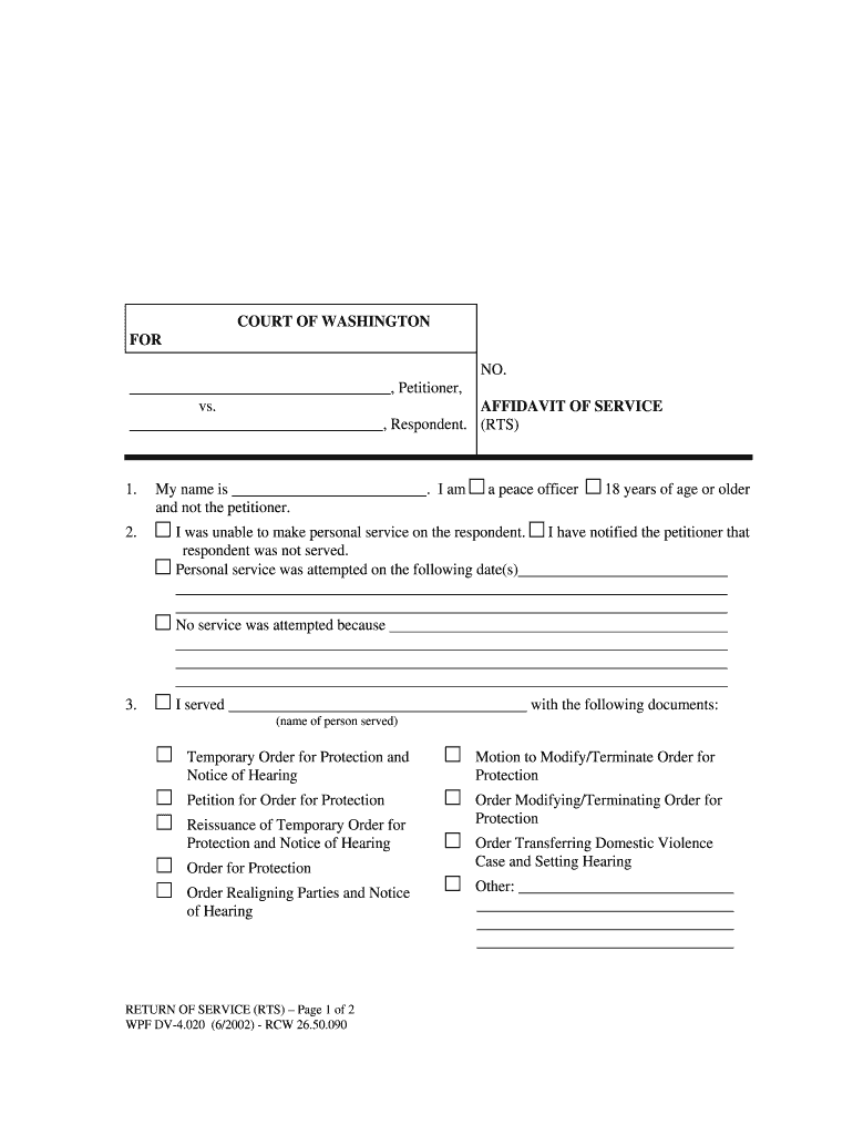 COURT OF WASHINGTON FOR NO. , Petitioner, vs. AFFIDAVIT OF SERVICE, Respondent. (RTS) 1. 2. My name is and not the petitioner. . I am a peace officer I was unable to make personal service on the respondent.